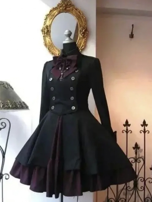 而给我带来的,是一套英伦风格的黑色礼服,衣服裙摆不长,暗紫色裙底正好盖过大腿,领部带有一个同样是暗紫色的大蝴蝶结,配套的是一双黑色吊带袜。