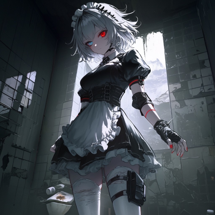 嗯?这次站在走廊对面的不是双子了,是一个白头发的小女仆,看起来年纪和拉夏差不多,脸上没什么表情,穿着一看就知道是女仆的女仆装,不过,脖子上戴着锁链,锁链从脖子连到腰部,再系着双手和双腿,她手上带着黑色无指手套,与她的打扮有点格格不入