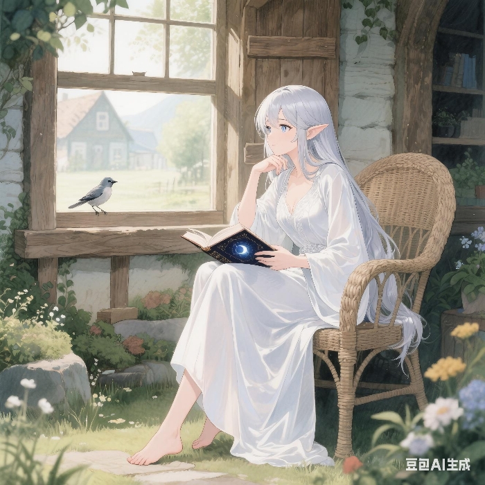 一只手慵懒地支着下巴,另一只手捧着一本厚重的、封面是某种深色皮革并镶嵌着秘银纹路的书,但那双如同沉寂冰湖般的银眸,此刻却放空地望向窗外跳跃在篱笆上的麻雀,显然心思早已飘远。