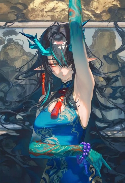 青墨勾勒的长发蜿蜒及地,其间点缀着若隐若现的墨绿龙角。